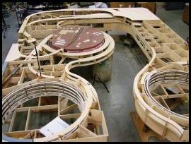 GRAND GORGE and WESTERN—LOS ANGELES—2017—HO SCALE Our client came to us with one request. Since he already had a European prototype Marklin layout at his home in France, now he wanted an American themed layout. It started simply enough, but rapidly became the most involved project we have tackled. The Corel drawing ended up with over 190 layers of track, structures, scenery, wiring and electronics. We soon found out he has an extensive collection of American prototype trains, dozens of them being 8-10 car brass passenger sets with 2-4 locomotives on the lead. The layout fits within a 16’ x 21’ room, is a walk-in design and is a free-lanced representation of West coast railroading between LA and Washington state. Because of the width of the room, the minimum radius had to be 32” and this is rather tight for some of his brass equipment. In between we have logging and a lumber mill, a small intermodal facility, a kit-bashed LA Union Station, a large turntable and roundhouse, a tall curved trestle as well as 3 other bridges and the Grand Gorge with a river winding through it. At each end of the C shaped layout, a four level helix takes trains up and down to storage in a 10 track hidden staging yard occupying a support level below the operations’ level. Maximum grade is in the helices where it is just under 1.9% The layout is controlled by Freiwald’s Train Controller software interfaced to NCE DCC equipment. There are 13 boosters. Staging tracks can all be turned on and off in train length sections by the computer. There are 43 electronic circuit breaker controlled power districts and 149 Block Detection Circuits and an additional 46 through beam Infrared Detectors. Dozens of accurate prototype scale signals, many with 2 and some with 3 heads are controlled to all aspects by the computer. Turnout position information is also provided to the computer from all 46 SMAIL™ equipped turnouts. Every structure is lighted and many have special effects that can be computer controlled. There are over 1000 lamps and LEDs providing the lighting. There are also a couple dozen sound modules under individual computer control. The computer is capable of running up to 6 trains at a time. |